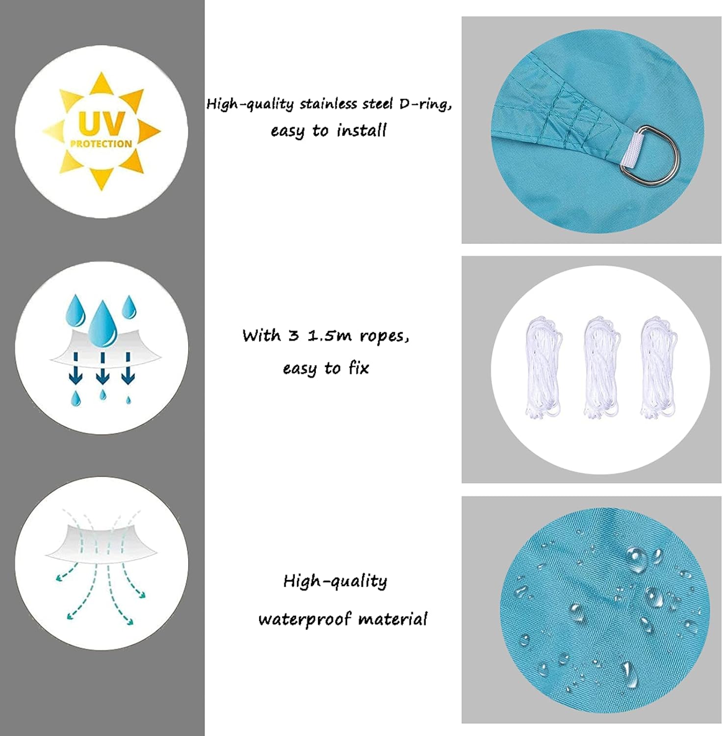Block Sunrays RURGLY High-density sun shade canopy can effectively block off 95% of harmful sunrays to protect skin, while allowing for cool breeze going through without trapping heat beneath Advantages: 1.High Quality Fabric Material:Shade sail is made from 160GSM new high-density polyethylene material 2. Rust Free D- Ring:Three corners are equipped with stainless steel D-rings for easier suspension 3.Reinforced Edge: the edges are double-folded and sewn to the corner with plenty of reinforcement 4.Curved Edges:Triangle shape with Curved sides, to enhancing pull strength and preventing drooping Specifications: Brand: DKLE Product Shape: Rectangle Product Type: Sun Shade Sail Material: 180 GSM HDPE(100% High Density Polyethylene) Package Included: 1 x Sun Shade Sail and 3 x Ropes(1.5m each) Tips: 1.Please measure your space before purchasing and choose the correct size. 2.Due to the light and screen setting difference, the item's color may be slightly different from the pictures 3.Please allow 1-3cm size difference due to manual measurement.